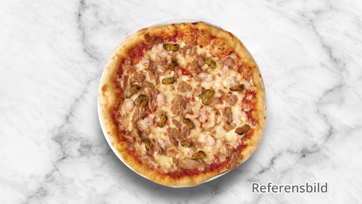 Tomatsås, mozzarella, räkor och kräftstjärtar.
