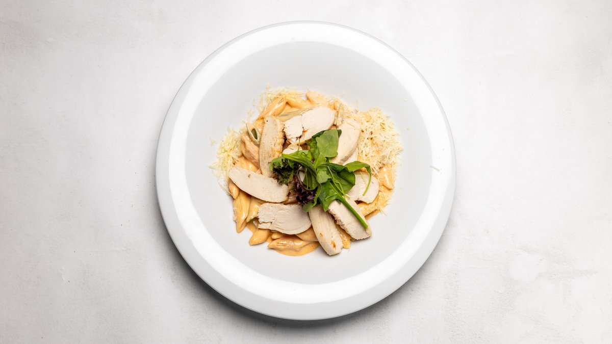 Pennepasta, kyckling och paprikasås.