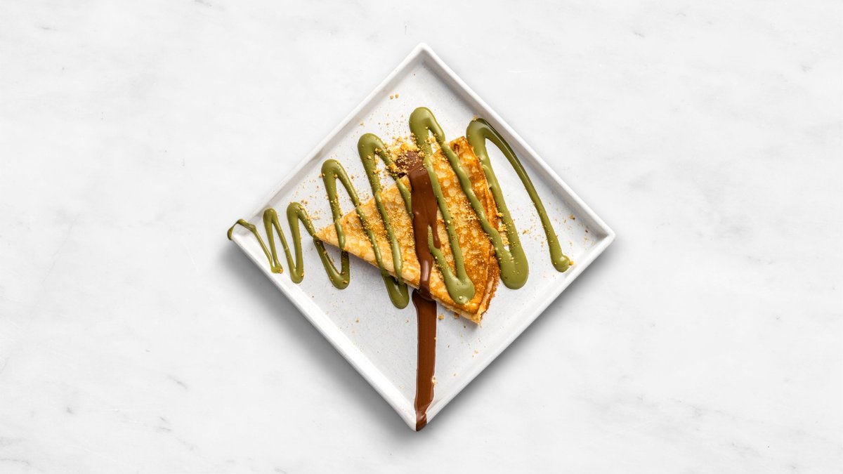 Fransk crêpe med kinder, mjölkchoklad, vitchoklad och smulad kex.