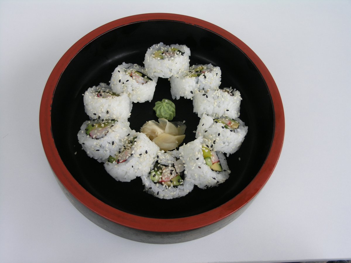 8 bitar. 3 st räka, 1 st avokado, 1 st omelett, 6 st små gurkrullar.
