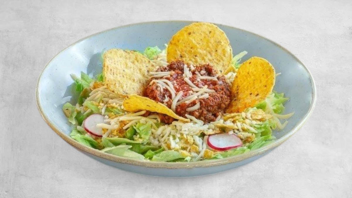 Fräsch sallad med krossade majschips. Serveras med ost, majs, hot-sås, blandsallad och valfritt protein.