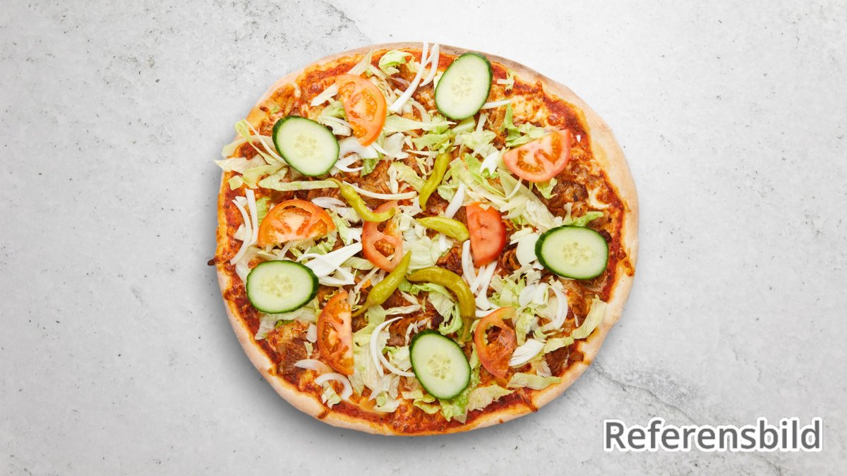Tomatsås, ost, kebabkött, sallad, tomater, gurka, feferoni och kebabsås.
