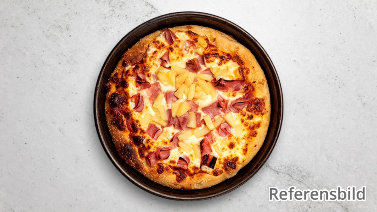 Tomatsås, ost, skinka, champinjoner och ananas.