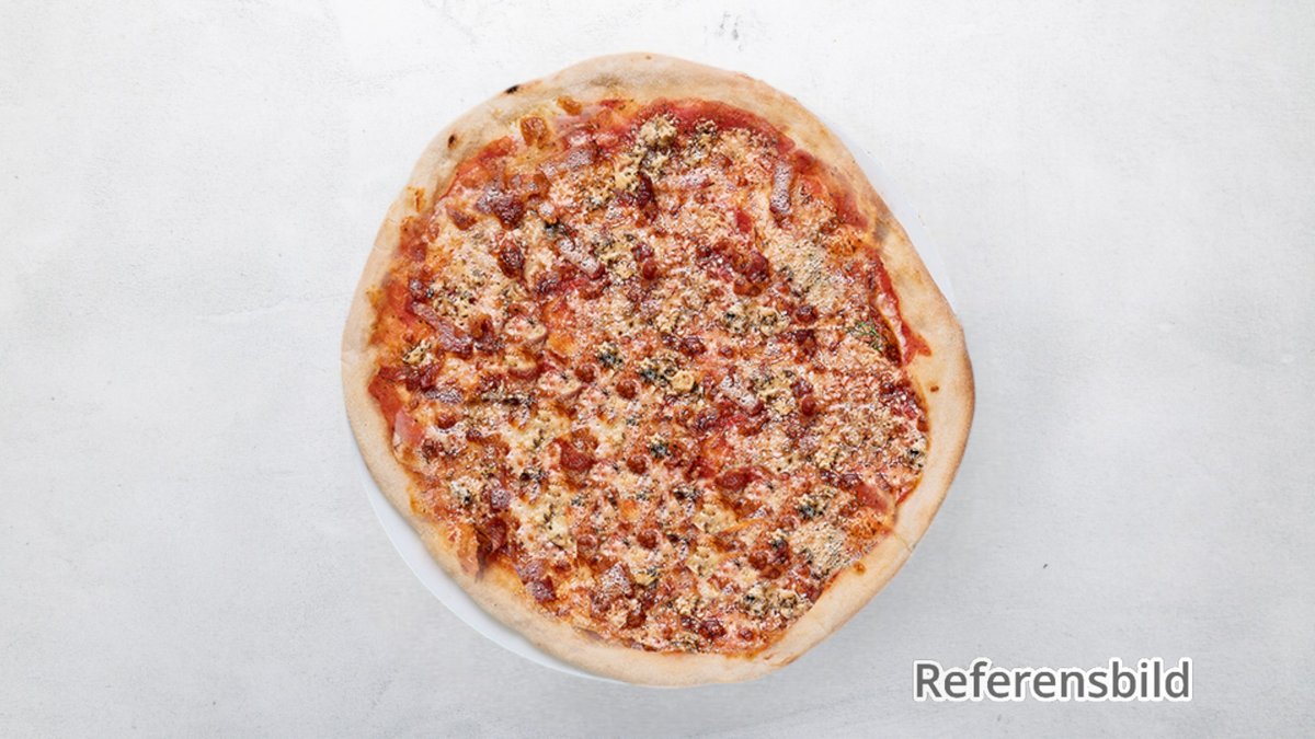 Tomatsås, ost, skinka, svamp, bacon, lök och köttfärssås.