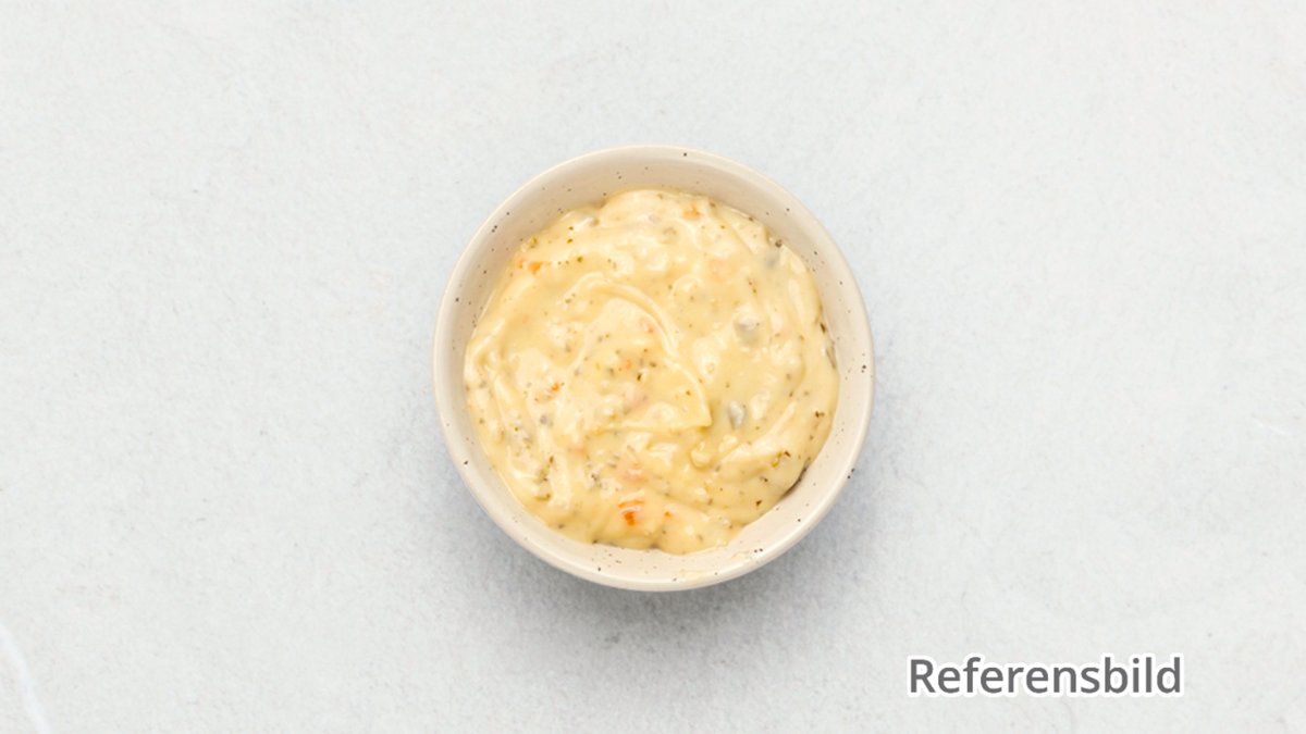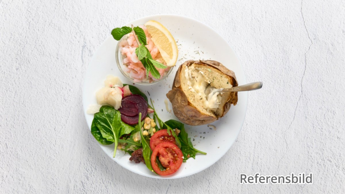 Isbergssallad, majs, tomat, gurka, salladost, oliver, kronärtskocka, sparris och tzatziki. Välj sås i nästa steg.