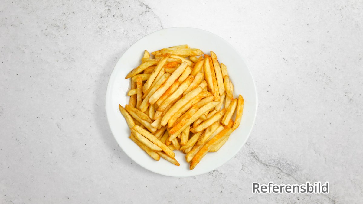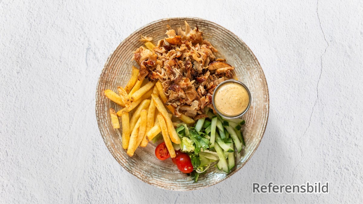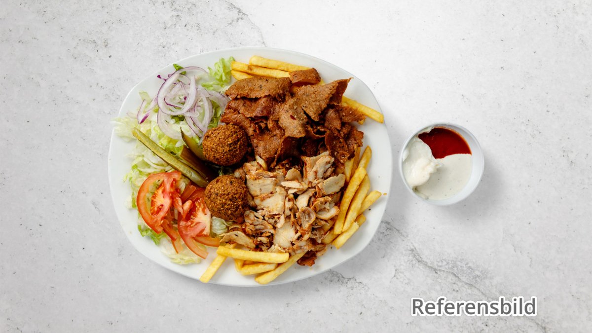 Tomatsås, ost, kebabkött, lök, pommes frites och mild kebabsås.