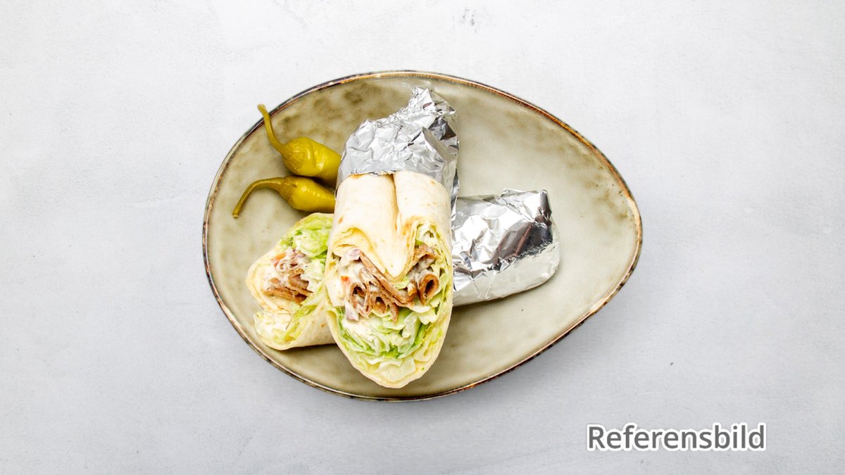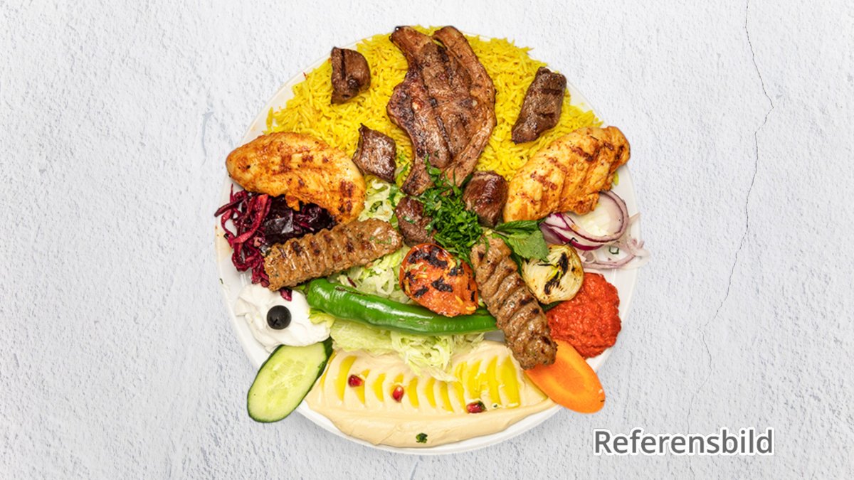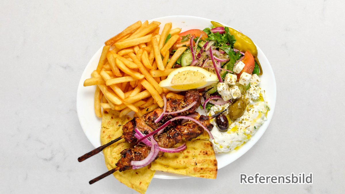 Isbergssallad, majs, tomat, gurka, salladost, oliver, lök, kebabkött och feferoni. Välj sås i nästa steg.