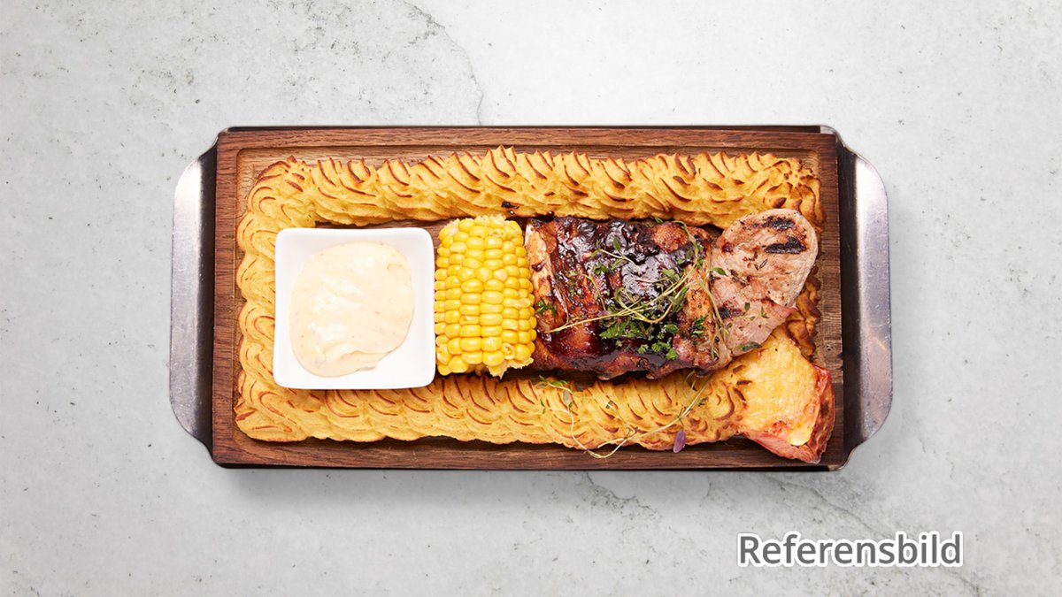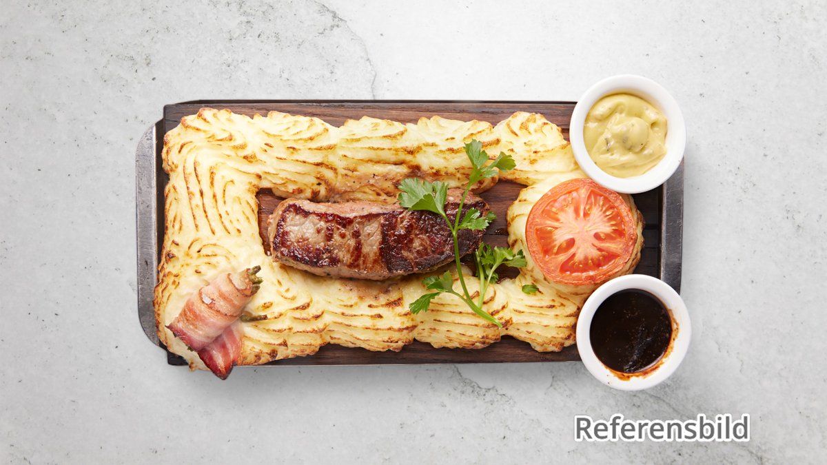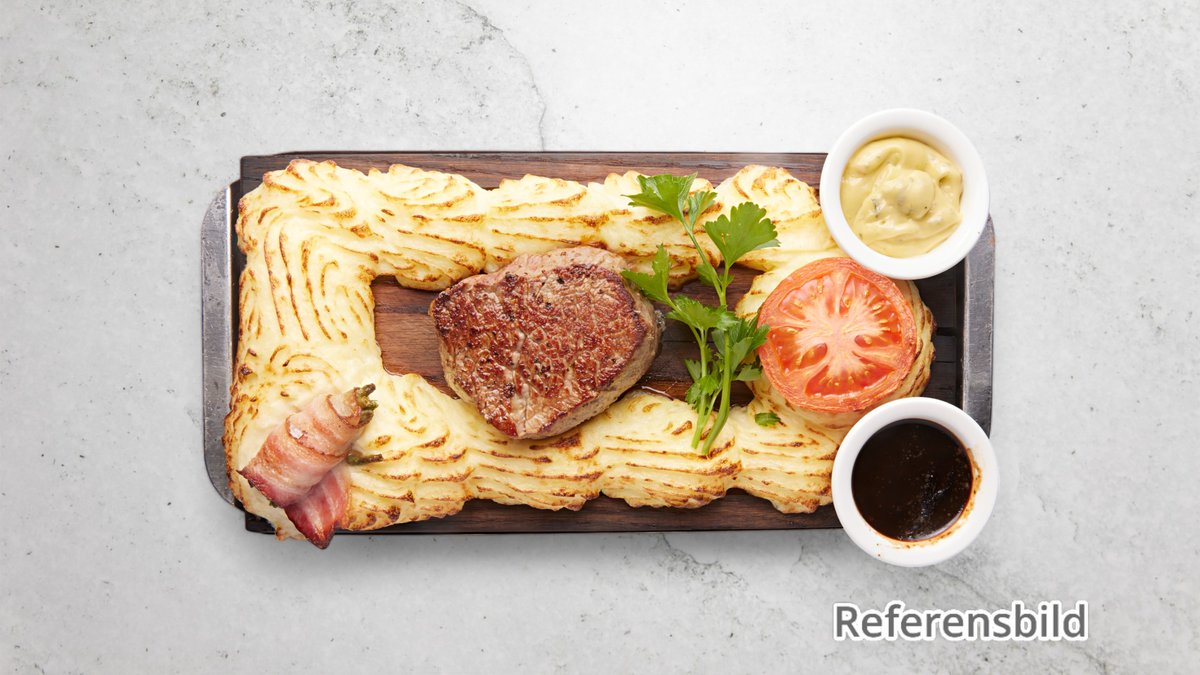 Tomatsås, ost, oxfilé och bearnaisesås.