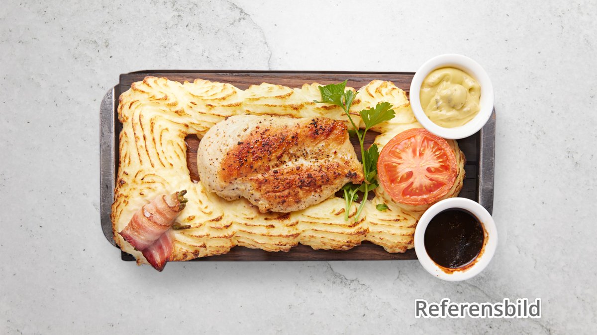 Tomatsås, ost, fläskfilé, skinka, champinjoner, lök och bearnaisesås.