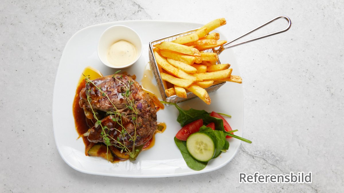 Färsk isbergssallad, tomat, gurka, lök, ketchup, bröd, pommes frites och dressing.