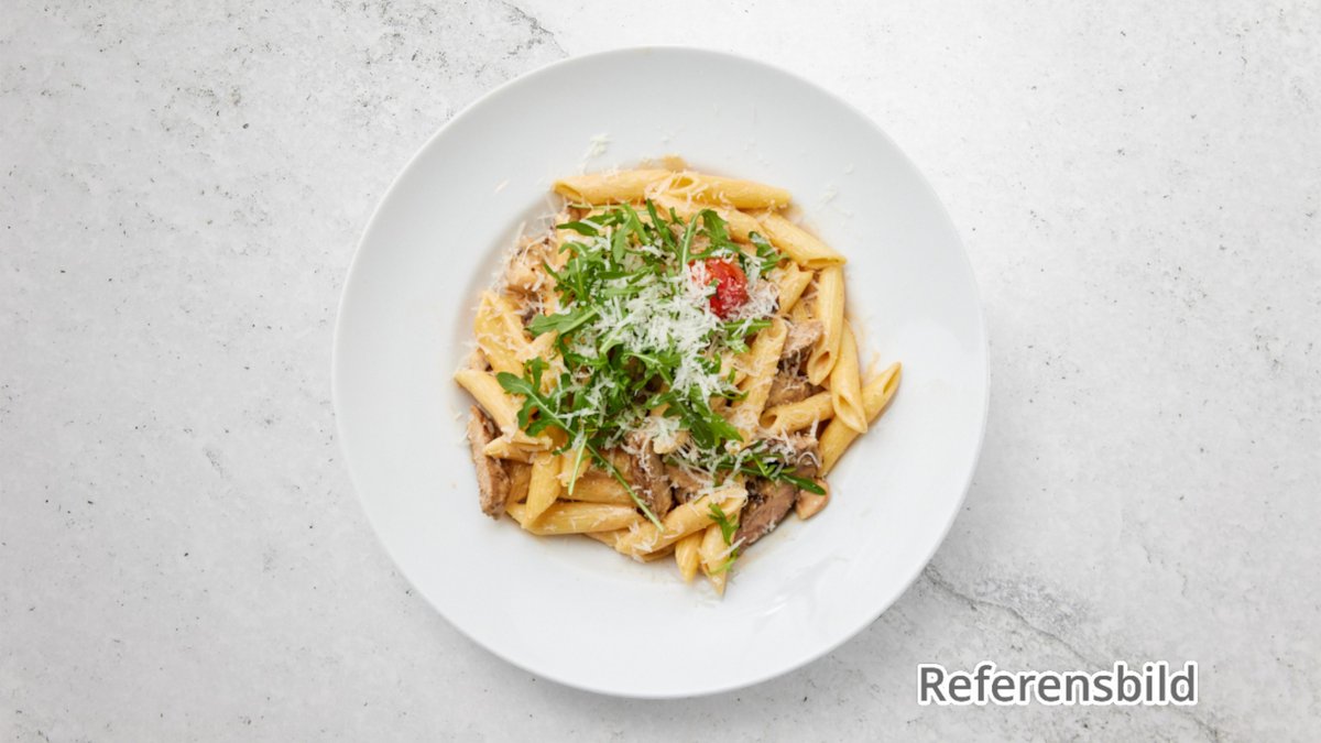 Tomatsås, ost, fläskfilé, lök, champinjoner och vitlök.