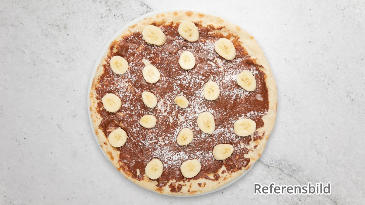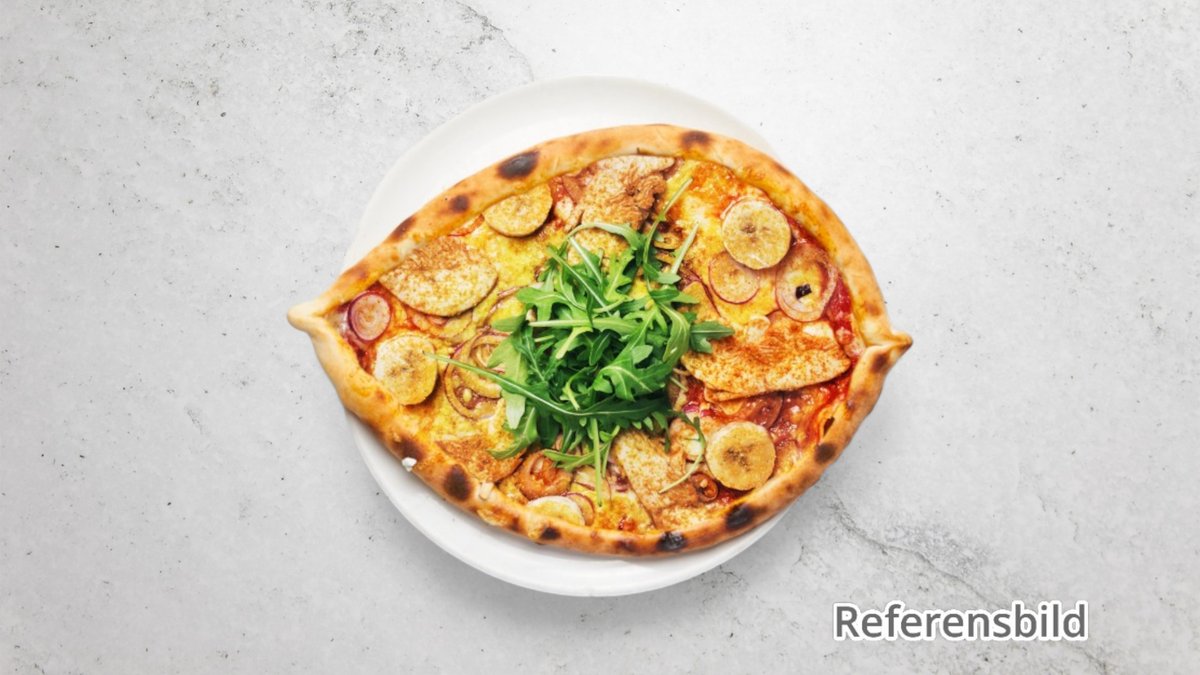Halvinbakad. Tomatsås, mozzarella, kyckling, ananas, banan och curry.