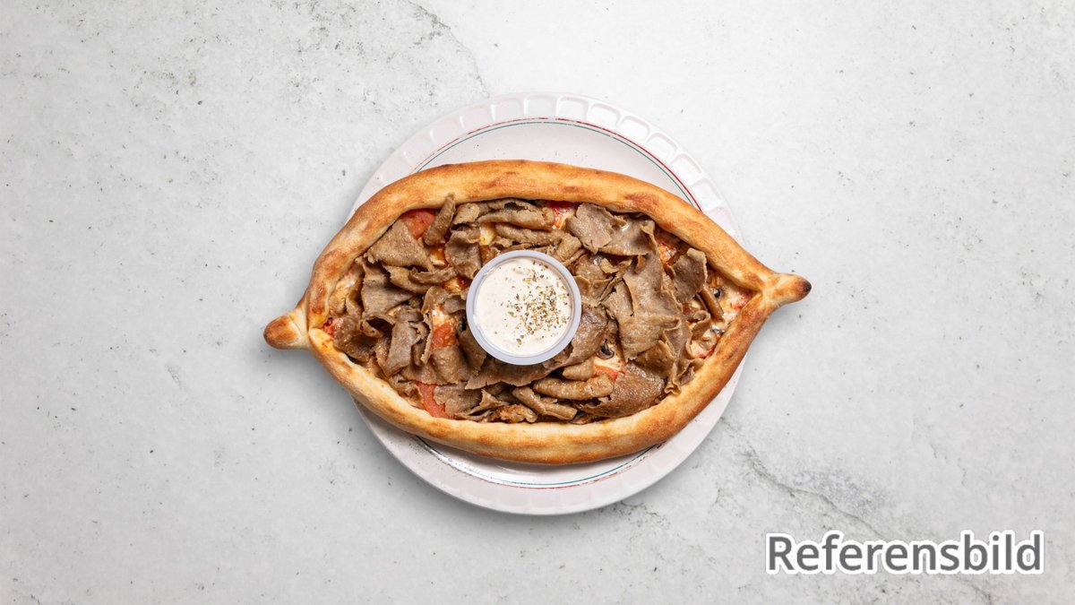 Halvinbakad. Tomatsås, mozzarella, kebabkött, lök och valfri sås.