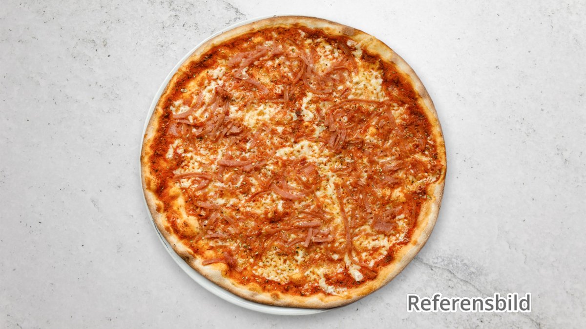 tomatsås, mozzarella, skinka, bacon, lök och pepperoni.