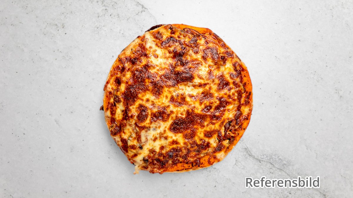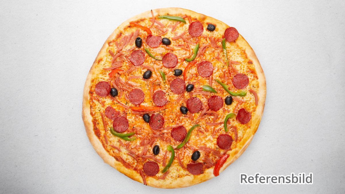 Tomatsås, ost, skinka, champinjoner, lök, salami och feferoni.