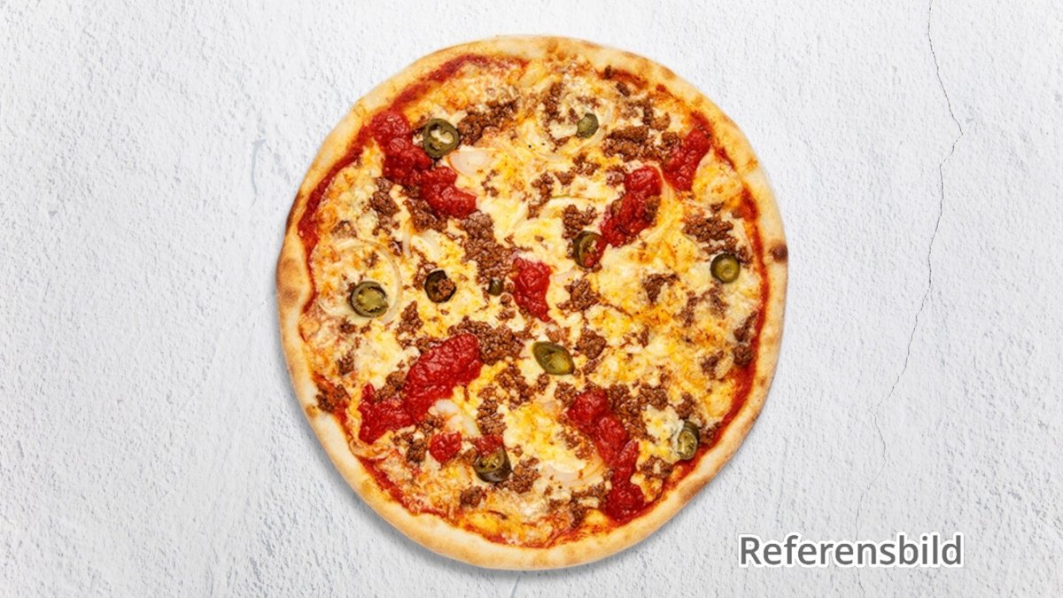 Tomatsås, ost, skinka, jalapeños, tacosås och tzatziki.