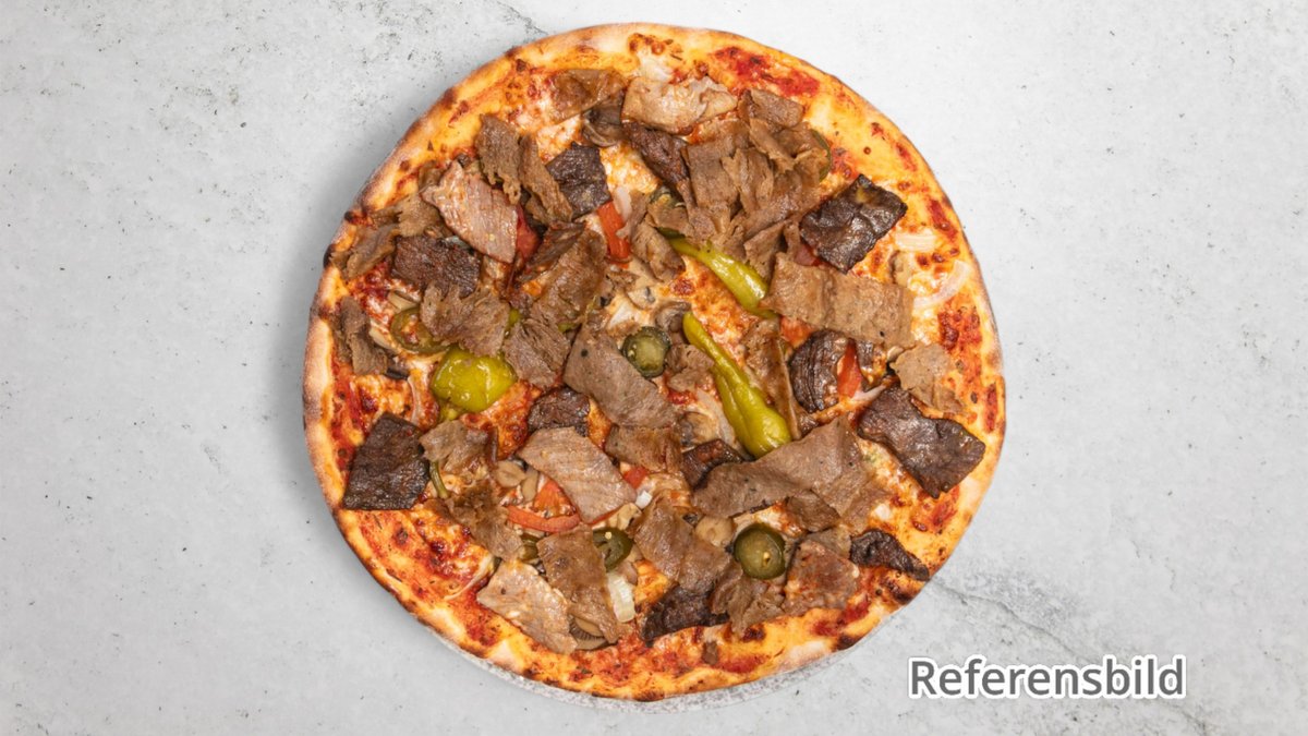 Halvinbakad. Tomatsås, mozzarella, champinjoner, lök, kebabkött och valfri sås.