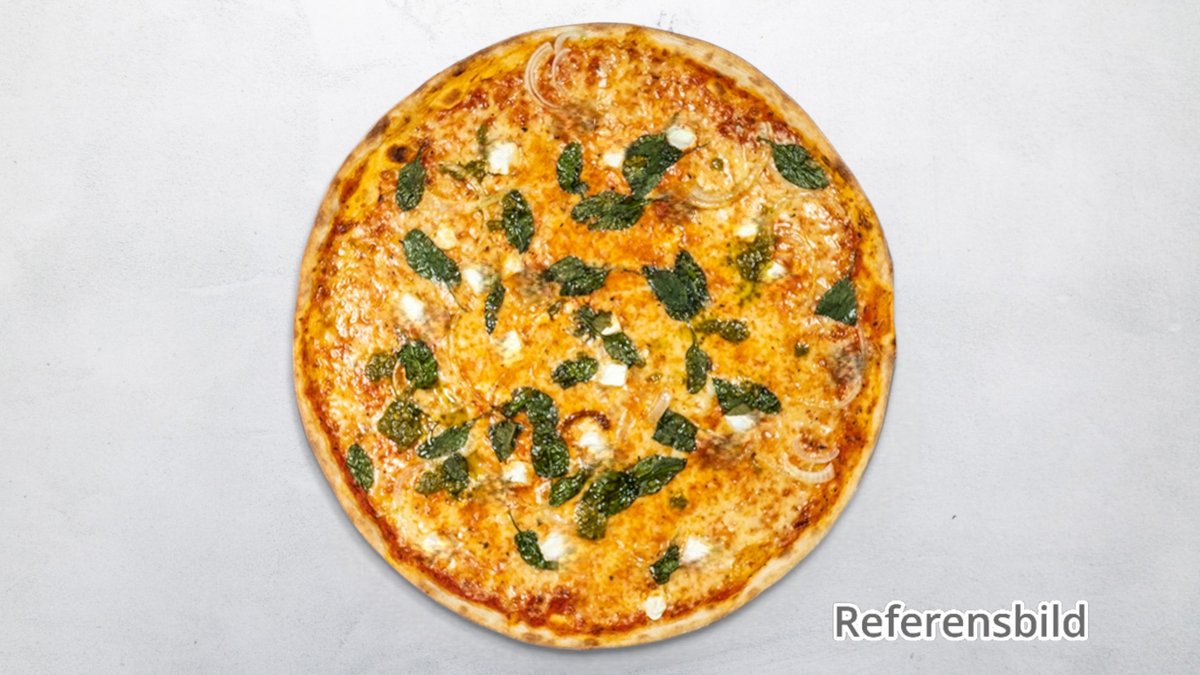 Tomatsås, mozzarella, skinka, köttfärs, lök, färsk vitlök och svartpeppar.