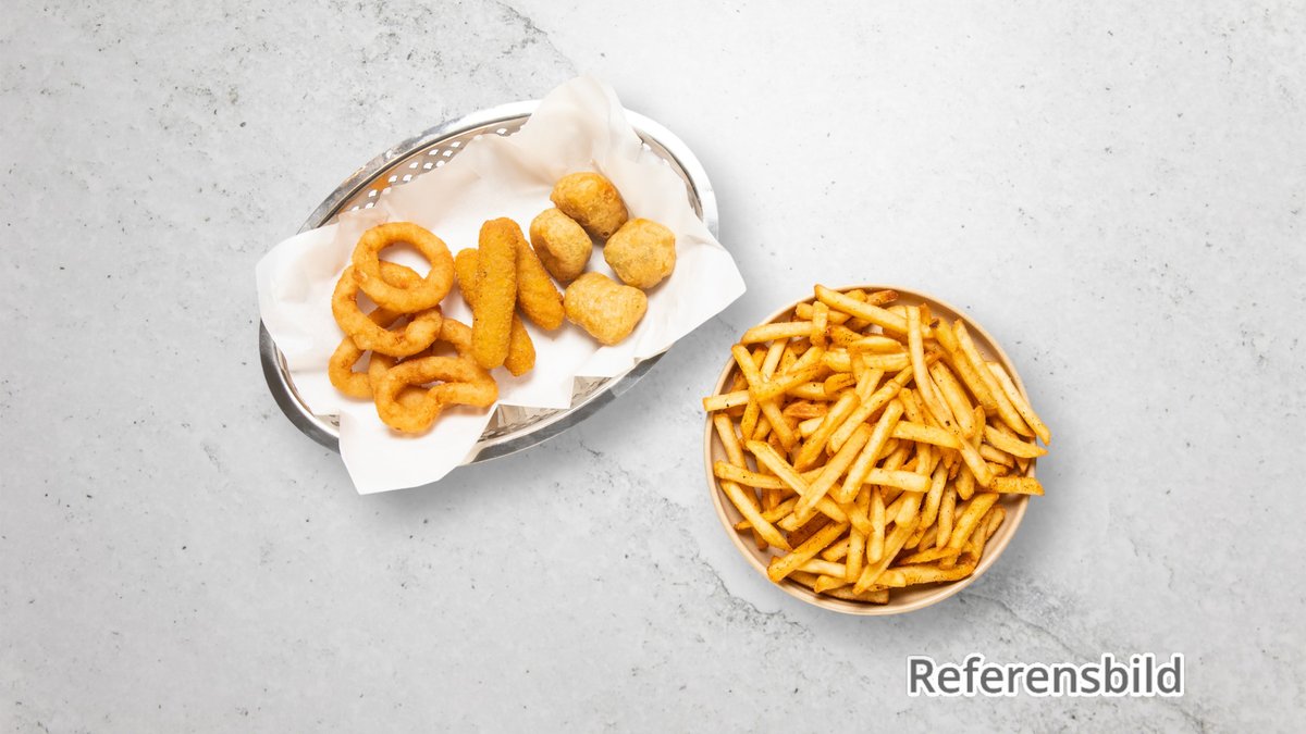 2 lökringar, 2 chili cheese, 2 champinjoner och liten pommes.