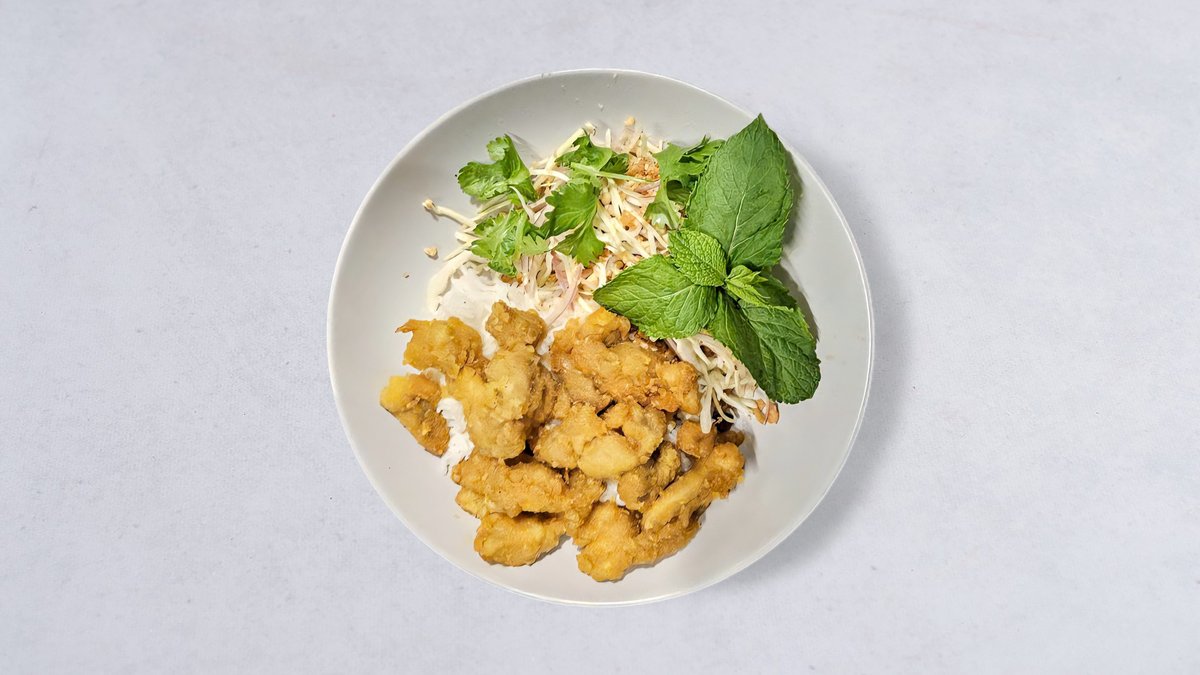 Blanda vietnamesisk sallad (vitkål, citronblad, koriander, mynta, basilika, chili, rostad lök och citronsås).