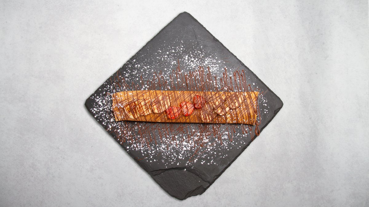 Dulce de leche, banan, kex, vit choklad, vaniljglass och karamellsås.
