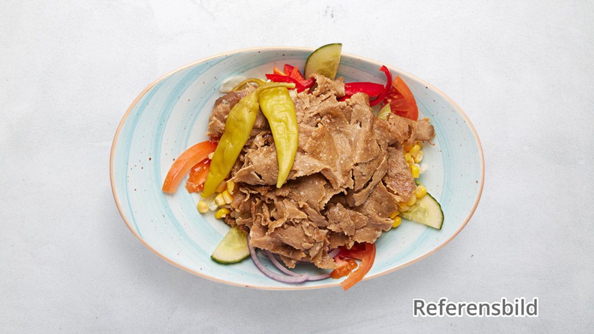 Isbergssallad, kebabkött, tomat, lök, feferoni och kebabsås.