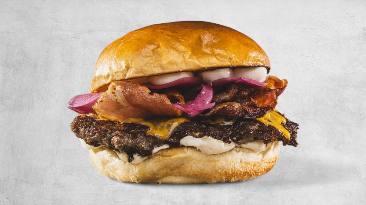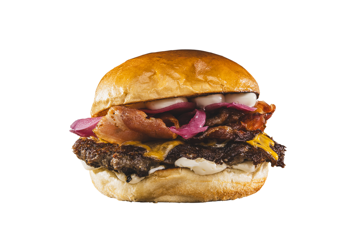 Burgare med ost, bacon, syrad lök & majonnäs. Pommes, dippsås och dryck ingår.