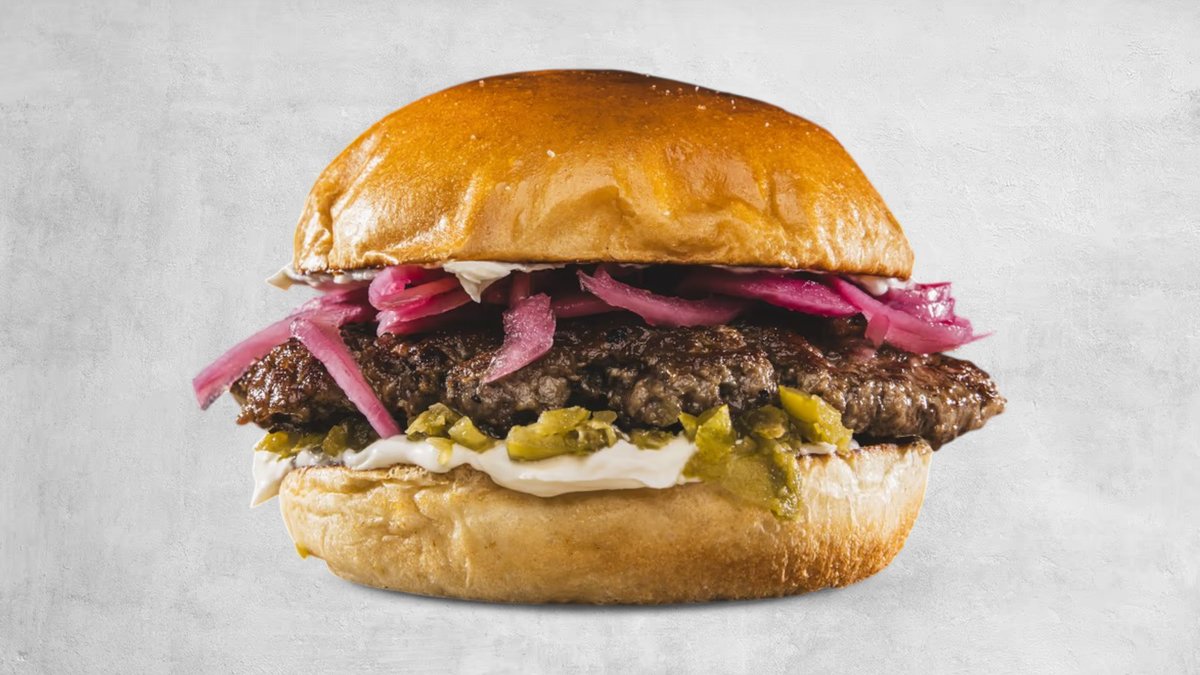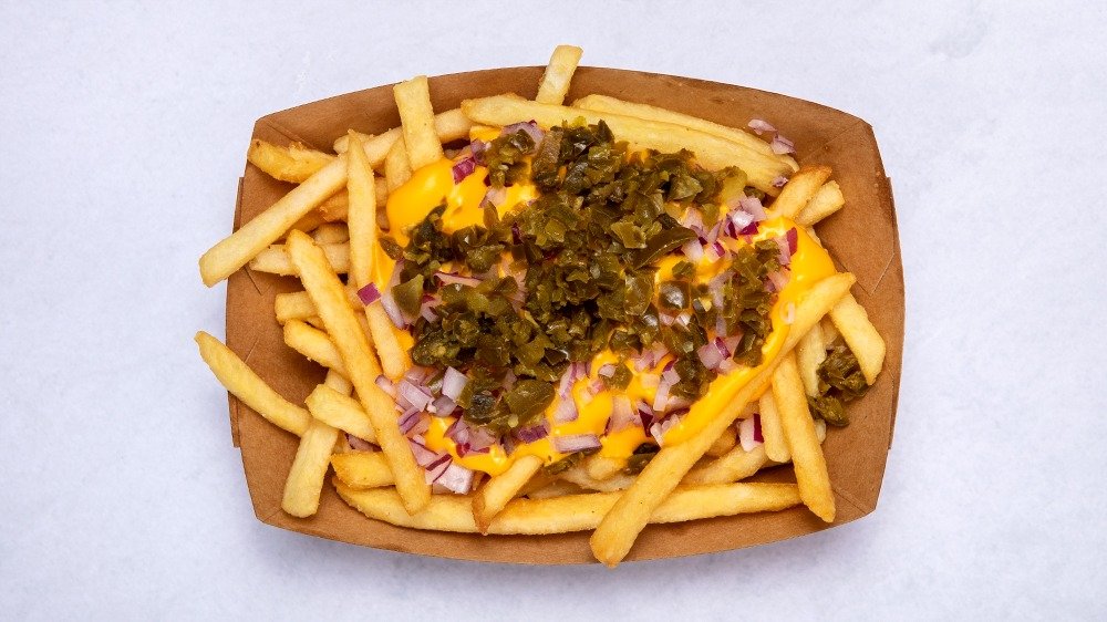 Ost, chipotlemajonnäs, karamelliserad lök, jalapeños och saltgurka.