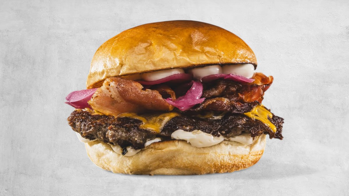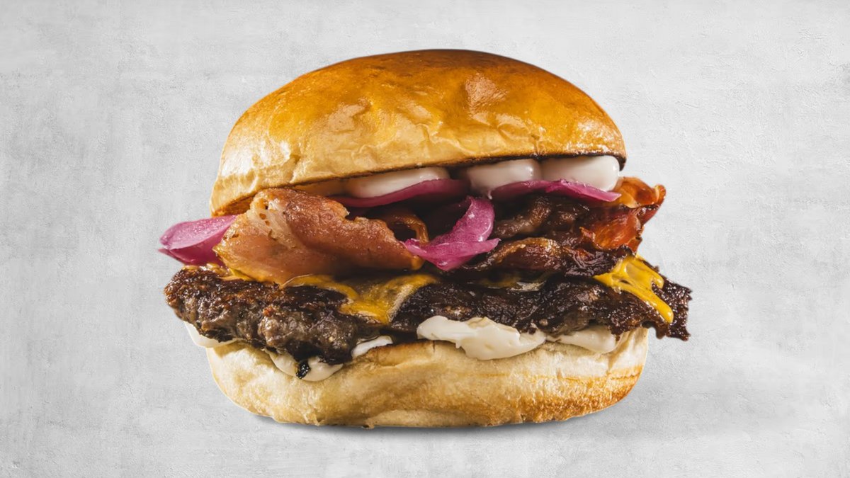 Burgare med ost, bacon, syrad lök och majonnäs. Pommes, dippsås och dryck ingår.