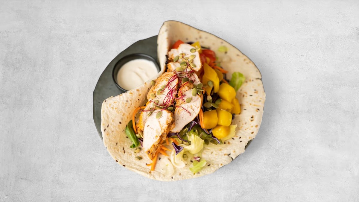 Wrap med skaldjur & syrad rödlök (375 kcal)