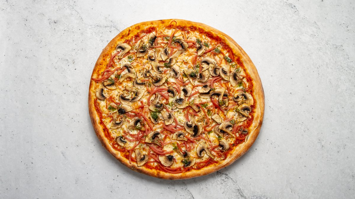 Tomatsås, tre sorters ost, skinka och färska champinjoner.