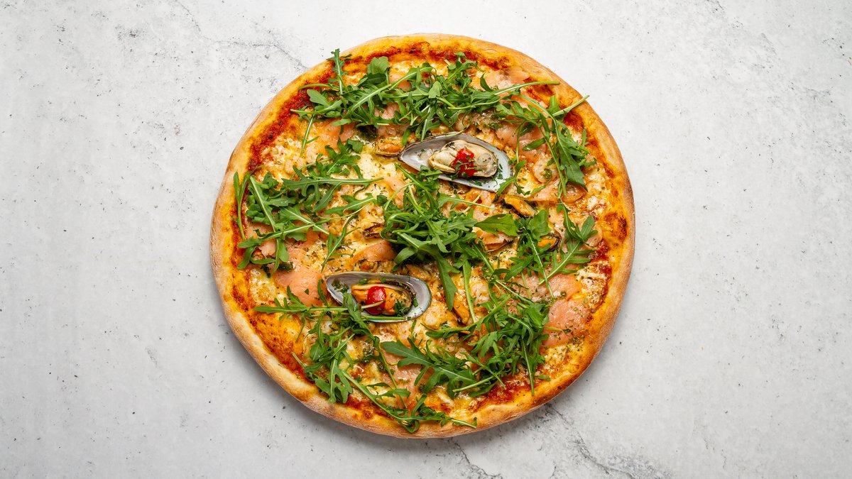 Tomatsås, tre sorters ost, färsk vitlök, gröna musslor, räkor, blåmusselkött, kallrökt lax och ruccola.