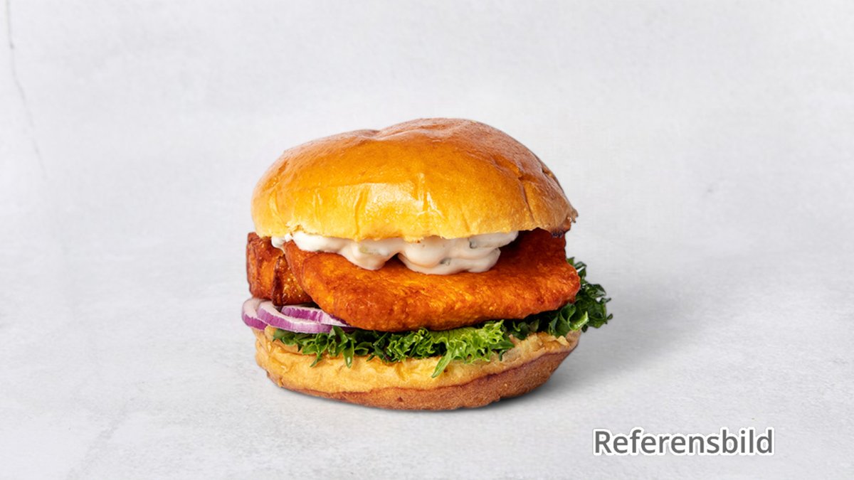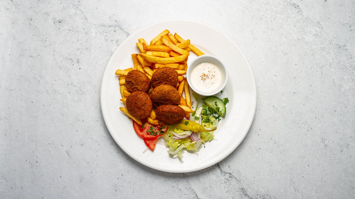 Serveras med pommes frites, sallad, färsk tomat, rödlök och dressing.