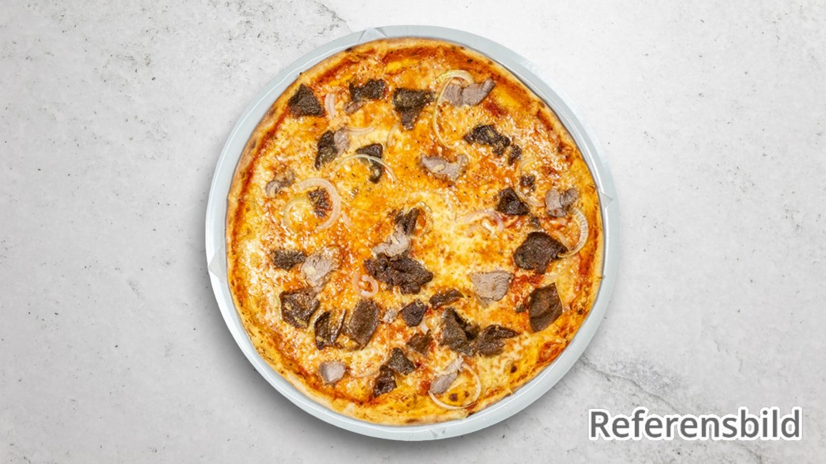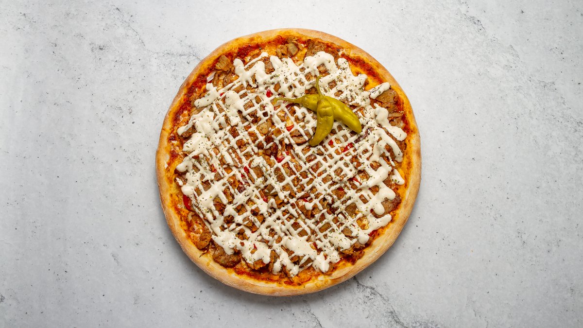 Tomatsås, tre sorters ost, rödlök, färska champinjoner, gyros, kebabsås, pommes och feferoni.
