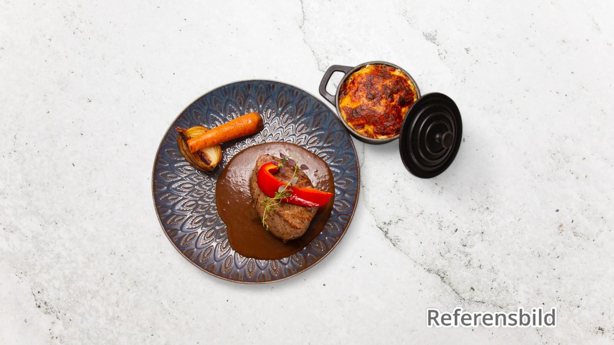 Serveras med klyftpotatis, färska wokade grönsaker, rödvinssås och vitlökscrème.