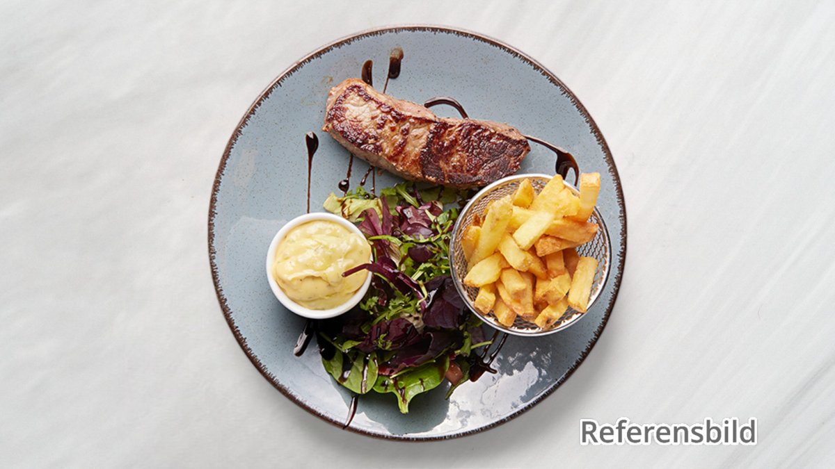 Serveras med pommes frites, bearnaisesås & rödvinssås.