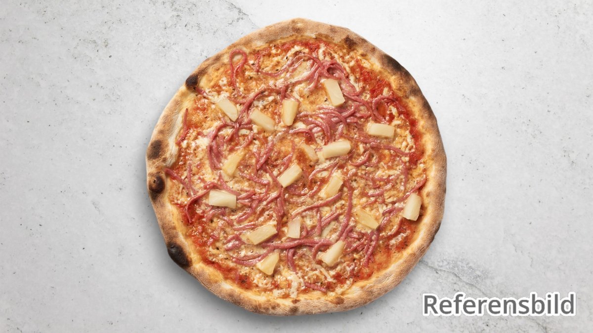 Tomatsås, tre sorters ost, skinka och ananas.