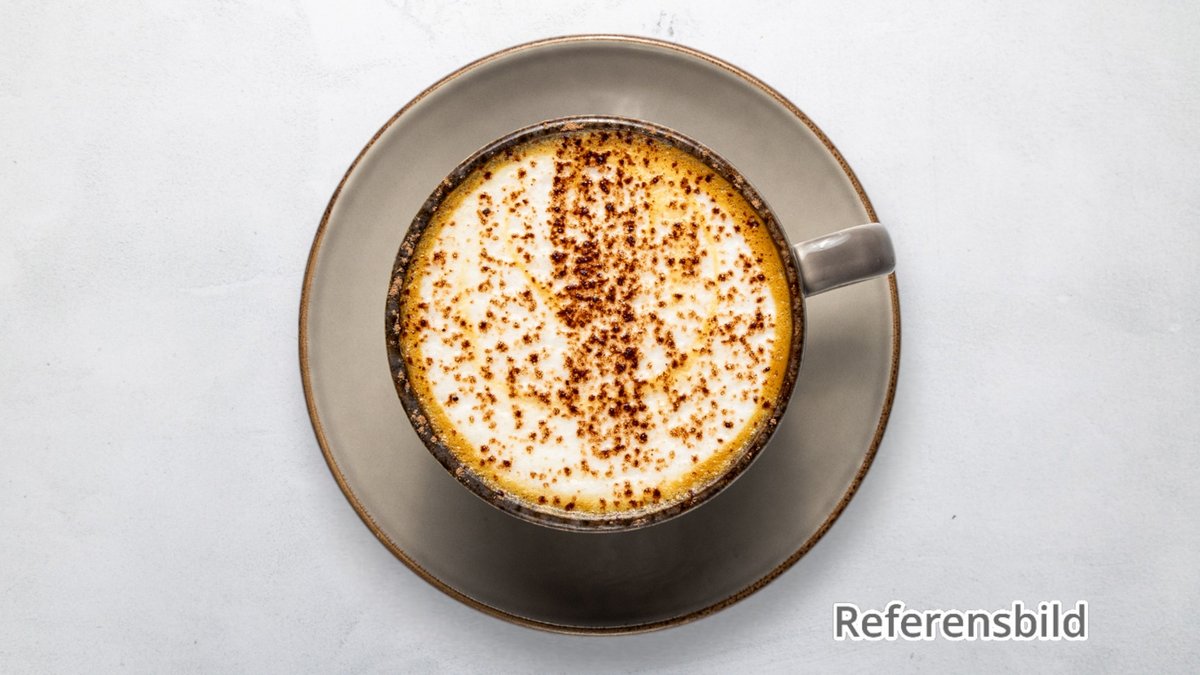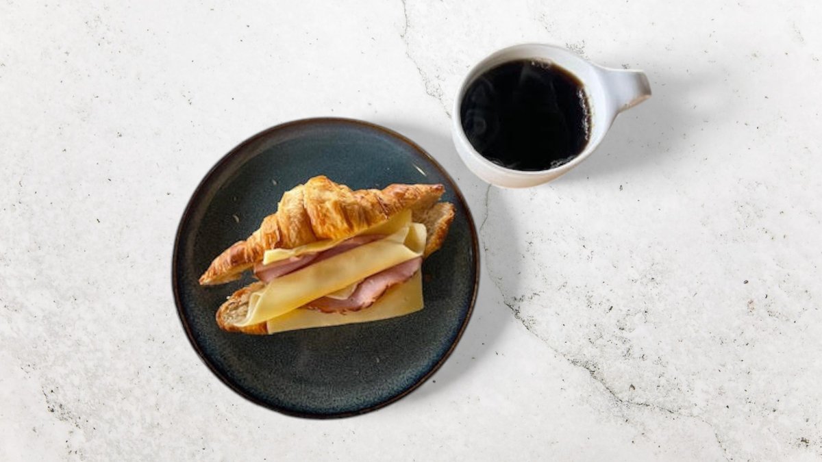 Croissant med ost och skinka. Serveras med nyrostat kaffe.