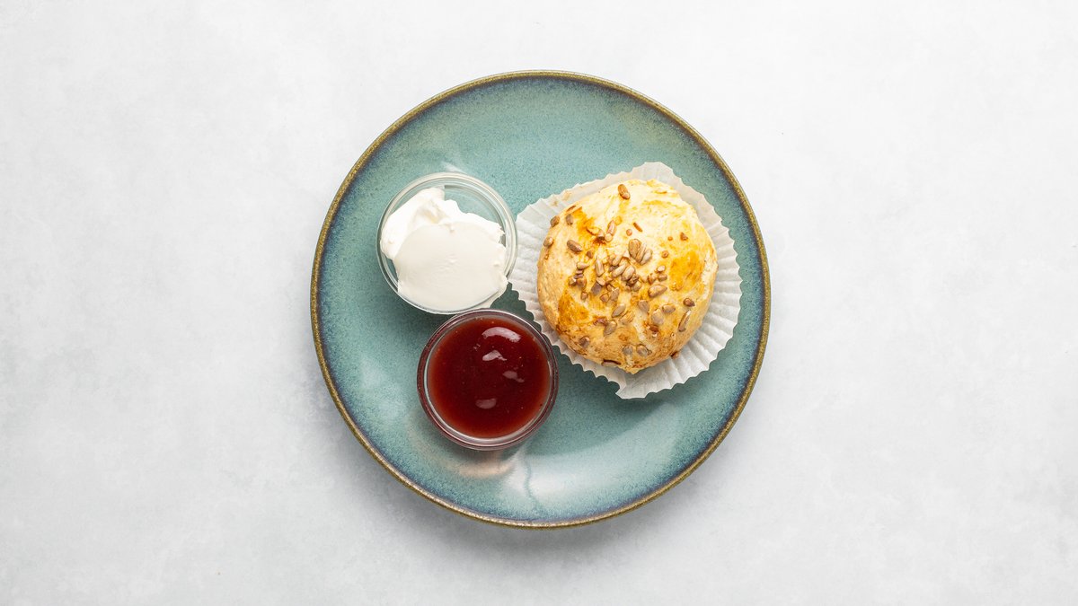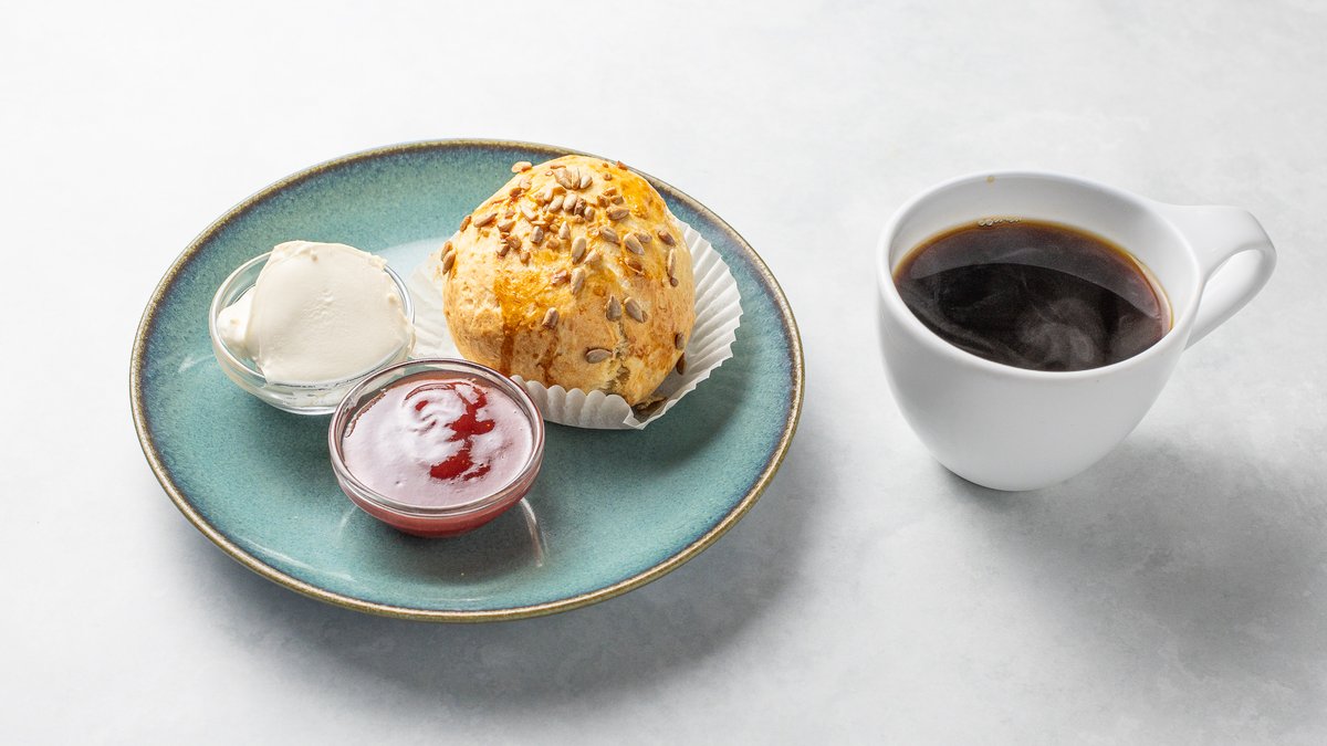 Hembakade scones serveras med cream cheese, sylt och kaffe.