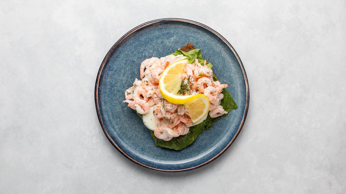 Skagenröra toppad med handskalade räkor samt citronklyfta.