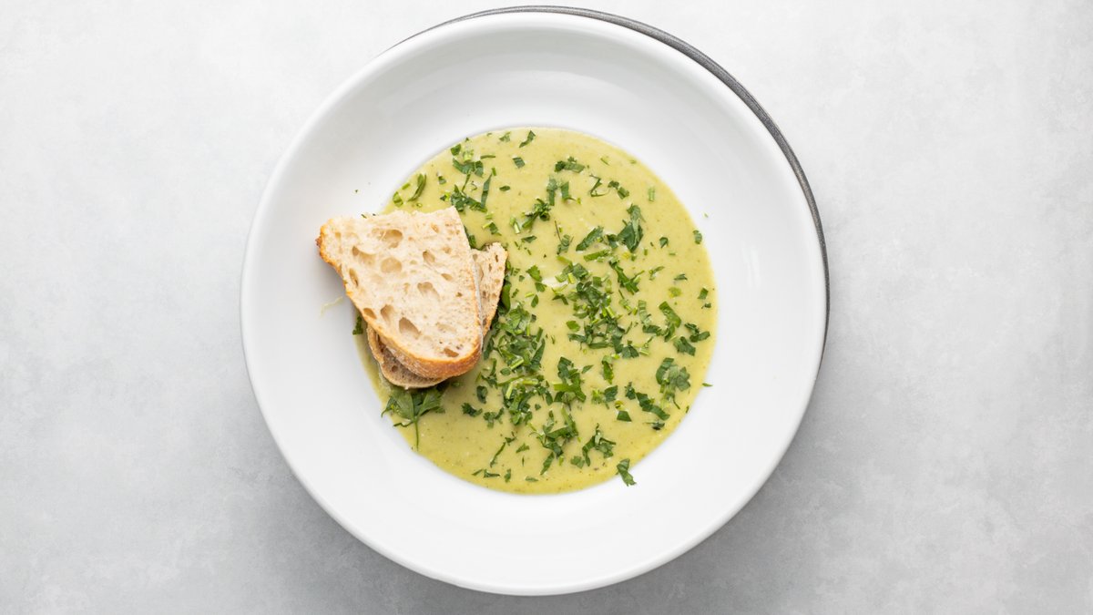Broccoli, purjo o potatissoppa Serveras med ostsmörgås.