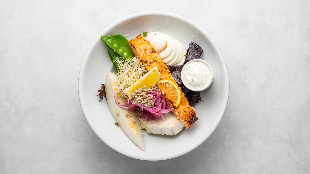 Ugnsbakad lax, rödbetor, chevreost, sugarsnaps, ägg och melon.