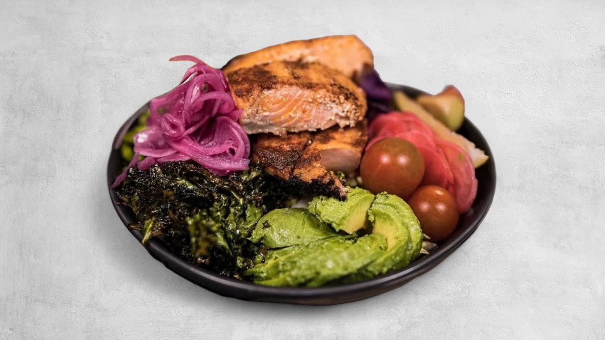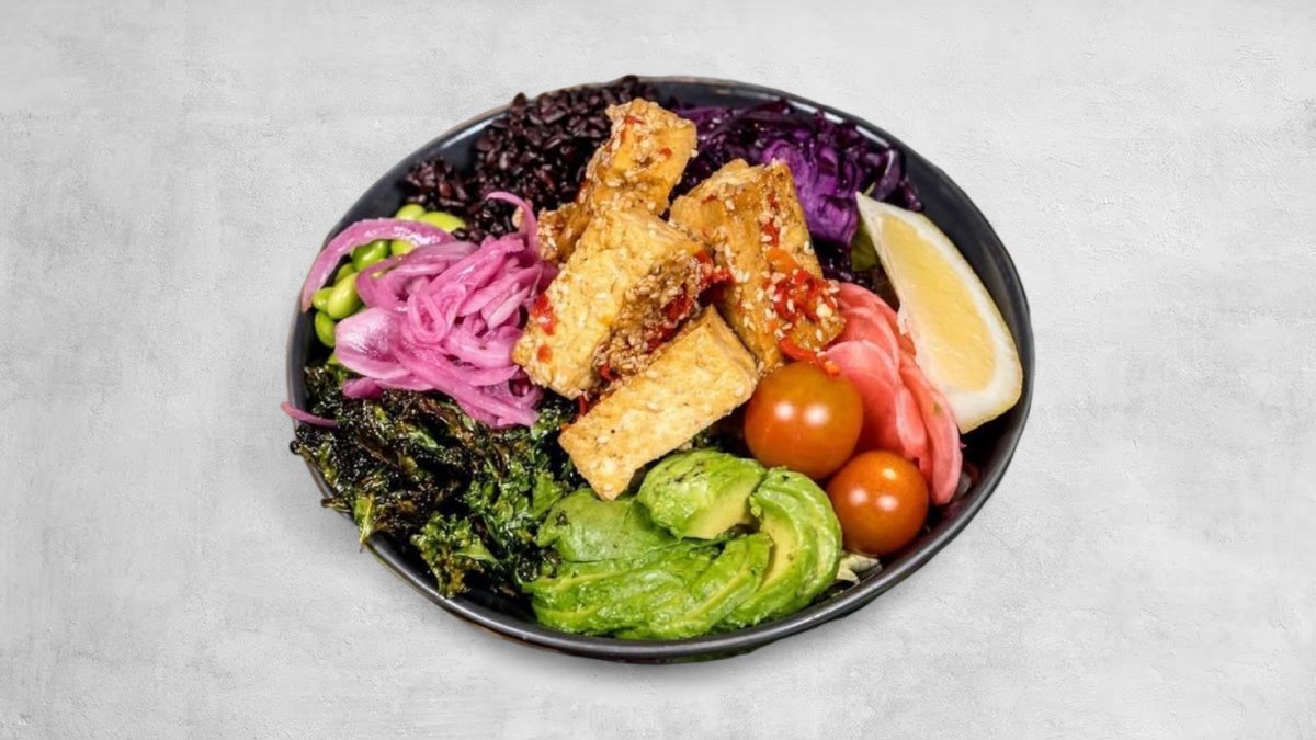 Svart råris eller quinoa, avokado, rödkål, rostad grönkål, picklade rädisor och rödlök, rostade solroskärnor, sojabönor och chilimajonnäs eller ponzusås.