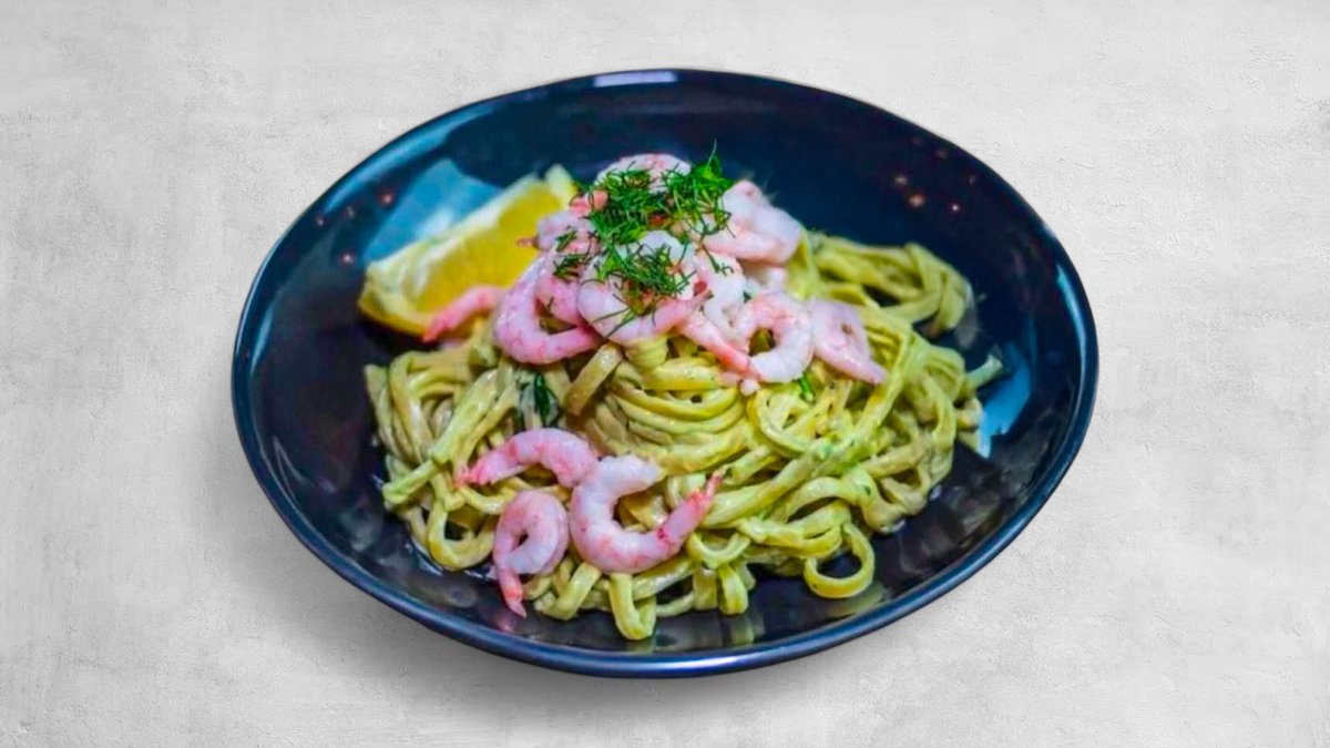 Linguine med krämig avokadokräm som toppas med räkor.