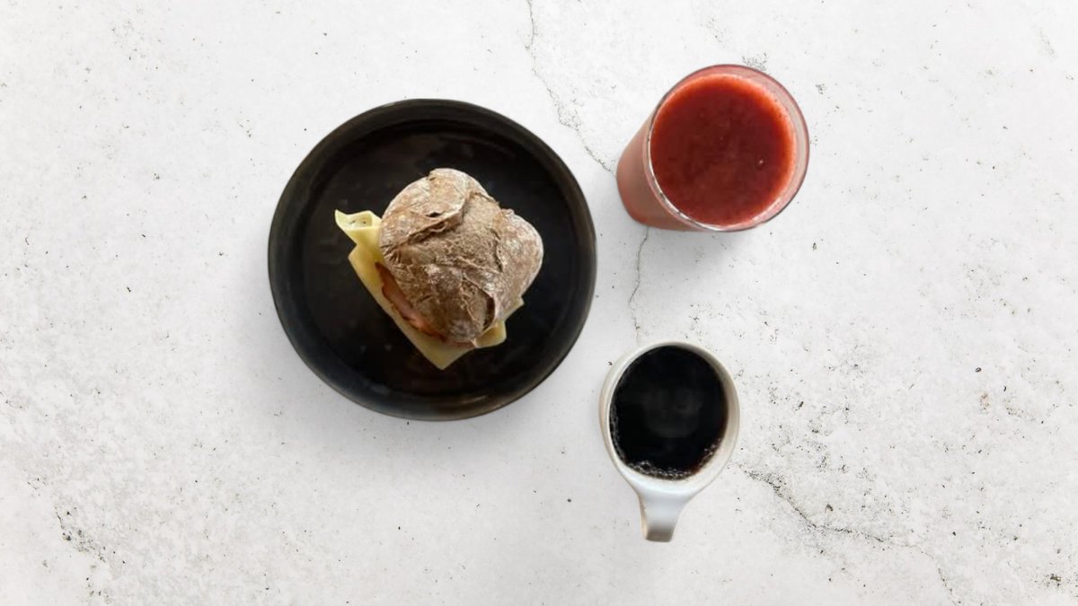 Ost och skinkfralla, jordgubb och mangosmoothie och nyrostat kaffe.