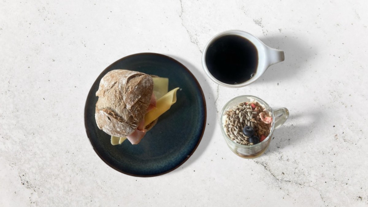 Ost och skinkfralla, grekisk yoghurt med granola och nyrostat kaffe