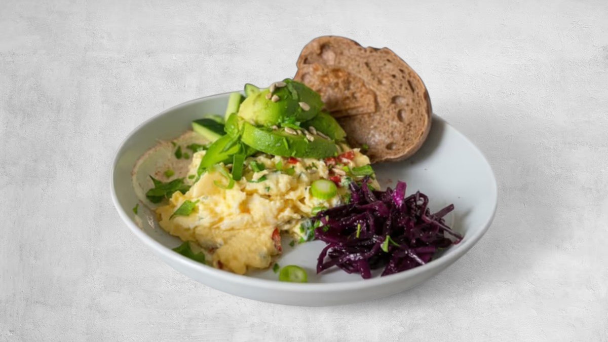 Scrambled eggs med avokado eller bacon, bröd och nyrostat kaffe.