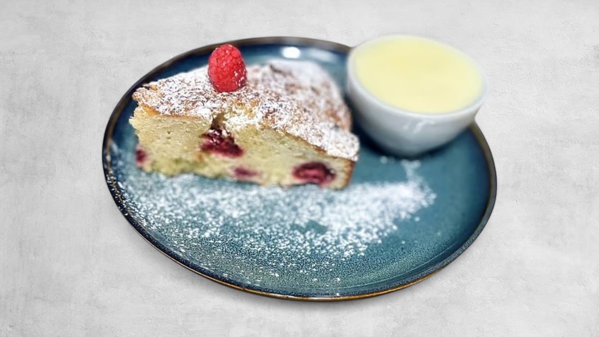 Hallonkaka med mandel och vispad vaniljsås.