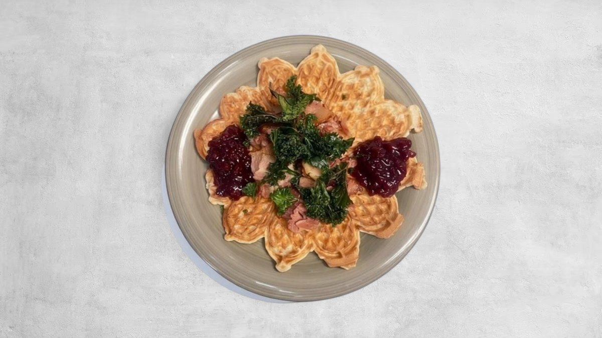 Raggmunksvåffla med bacon, rårörda lingon och rostad grönkål.