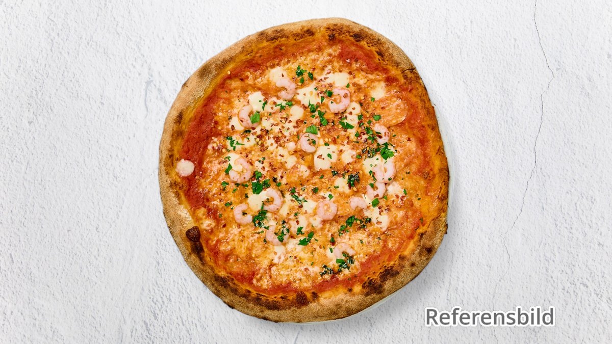 Tomatsås, mozzarella, prosciutto cotto (kokt italiensk skinka), handskalade räkor, blåmusslor, champinjoner, färsk tomat, kronärtskocka, oliver och vitlöksolja.